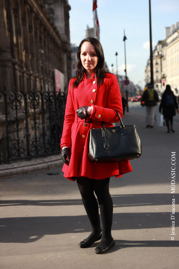 Effectivement vous allez me dire qu’elle ne porte pas de cape rouge et on la félicite ! Elle l’a troqué pour un joli manteau trapèze rouge ajusté à la taille et mis en avant le coté chic avec un sac noir coordonné au reste de sa tenue.